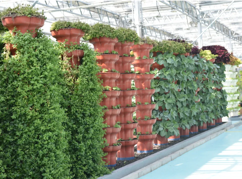 ▼江蘇金湖水漾年華蔬菜館未來蔬菜區展示了花瓣栽培、抱柱式栽培、傳統架田與控根容器栽培等10余種栽培模式。花瓣栽培與抱柱式栽培特點是受光均勻,美觀大氣。倒掛式氣霧培仿照游樂設施的一種新型栽培方式,通過霧化直達植物根系進行噴淋。氣霧培是當前世界上最為前沿的無土栽培技術,它與水培技術相比,可以節省更多的能源與更少的水分及營養液的外排浪費,是一種更適合工廠化立體化高效率栽培的植物培育新方法。