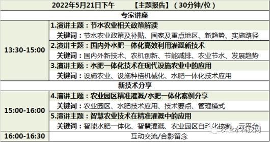聚焦熱點:聚焦農業節水灌溉實時熱點,探討涉及領域的重點、難點、痛點,尋求解決問題的思路與途徑。權威解析:匯聚國內外農業灌溉領域權威專家,解析現代化進程下國內外農業節水灌溉發展的新理念、新模式、新業態、新科技。實踐經驗:農業灌溉行業踐行者和先鋒現身說法,剖析典型落地案例,提供成功運作經營經驗。共享資源:搭建推廣、交流、服務平臺,展示項目、產品、品牌,共享人脈、資源、理念。會議時間(擬):2022年5月21日 下午會議地點:北京·國家展覽中心(靜安莊)會議形式:線下+線上直播論壇內容(擬)