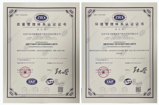 近日,北京中農天陸微納米氣泡水科技有限公司(簡稱 中農天陸)通過一系列綜合評測,再次順利通過ISO9001質量體系認證與ISO14001環境體系認證,并獲得證書。