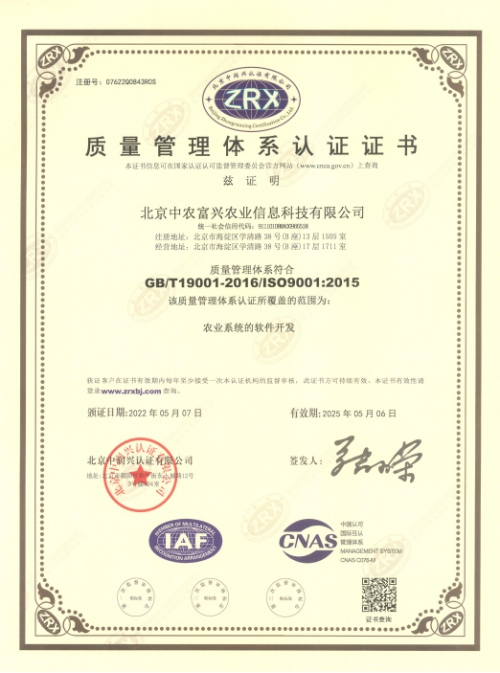 近日,北京中農(nóng)富興農(nóng)業(yè)信息科技有限公司(簡稱 中農(nóng)富興)通過一系列綜合評測,再次順利通過ISO9001質(zhì)量體系認(rèn)證,并獲得證書。