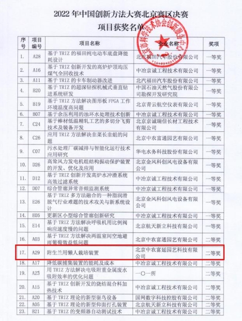 2022年11月7日-8日,以“堅定創新自信 促進自立自強”為主題的中國創新方法大賽北京賽區決賽在京順利舉行。本次大賽由北京市科學技術協會,北京市科學技術委員會、中關村科技園區管理委員會,北京市總工會,北京市工商業聯合會共同主辦。大賽共評選出一等獎項目15個、二等獎項目35個、三等獎項目50個。中農富延創新研究《附生蘭用懶人栽培裝置》榮獲本次大賽二等獎。