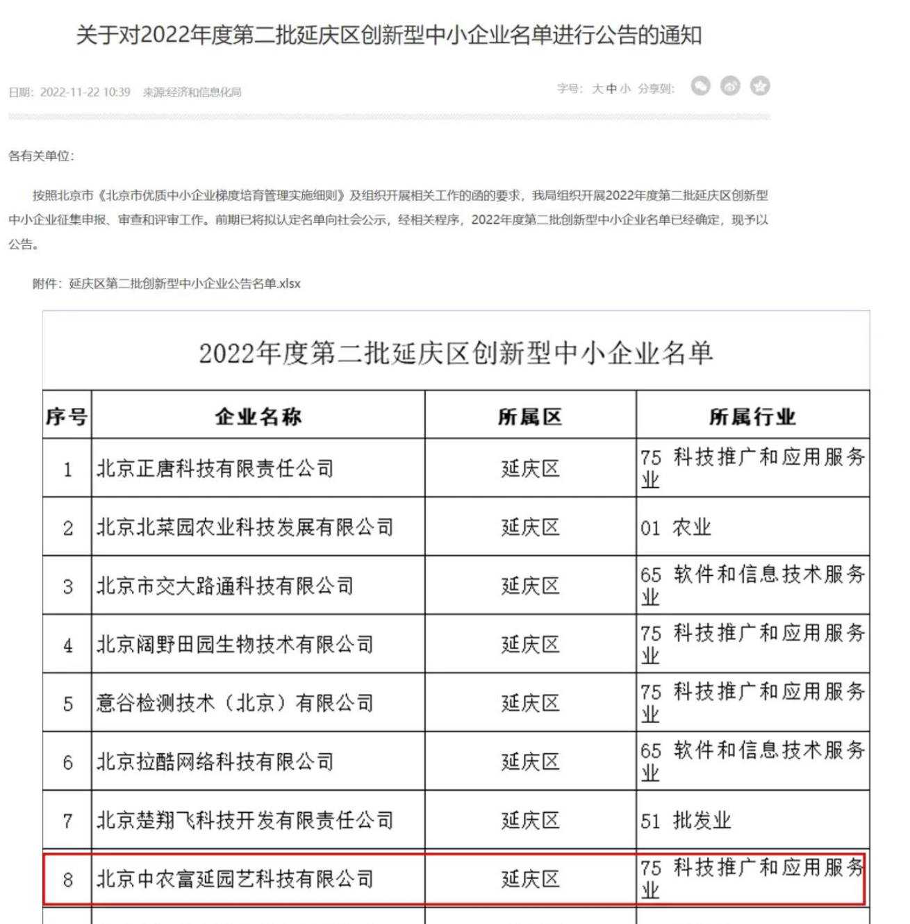11月22日,北京市延慶區公示了2022年度延慶區第二批創新型中小企業名單。此次,北京中農富延園藝科技有限公司(簡稱中農富延)作為區內科技推廣和應用服務業行業代表之一,被認定為“創新型中小企業”。