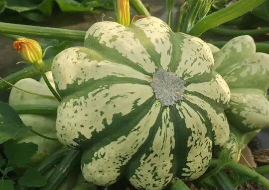 迷你綠貝:迷你型小南瓜,扁圓形,肉質(zhì)厚。成熟果實奶油白色與深綠色條紋形成鮮明對比。果型美觀,單果重約200g左右。果肉橘黃色,口感較好,耐儲藏。單株可結(jié)果10個左右。