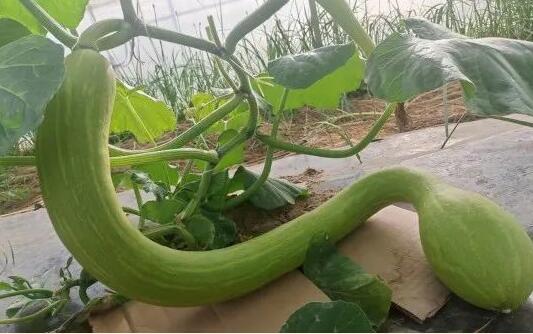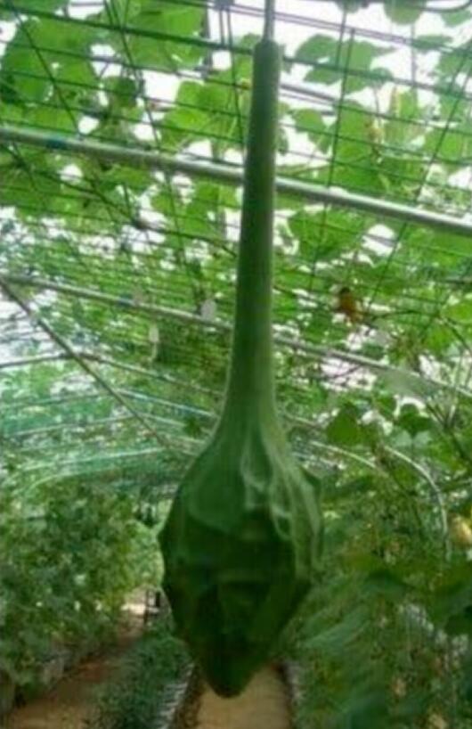 鶴首葫蘆:葫蘆科瓠瓜屬,極具觀賞性的奇形葫蘆晶種,果實外形似鶴首,上方具細(xì)長柄,下方高球形,果實下部奇形怪狀。為不規(guī)凹凸面。顏色綠中帶黑。表面有明顯的棱線突起。表皮墨綠色。果實長40-50cm ,橫徑15-20cm,果重1.5-2.5kg。中熟。生長期100-120天。