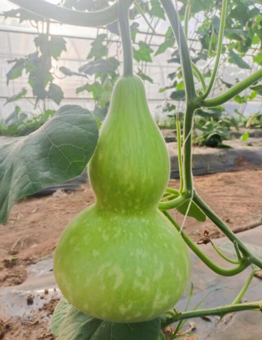 長柄葫蘆:一年生草本,長勢強(qiáng),葫蘆下部球形,上部細(xì)長,柄長50-80cm。