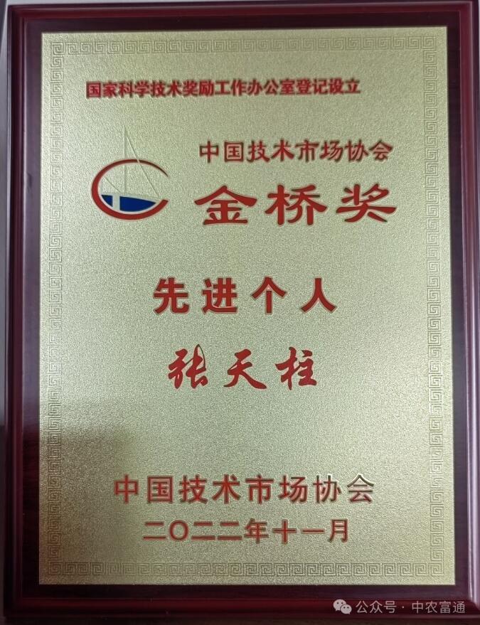 中國農業大學張天柱教授榮獲中國技術市場協會金橋獎先進個人稱號