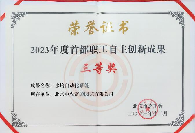 4月28日,北京市總工會辦公室發布關于認定2023年度市級(示范性)職工創新工作室、名師帶徒和首都職工自主創新成果的決定。經單位推薦、專家評審等環節,北京市總工會決定,認定北京中農富通園藝有限公司園藝栽培設施與模式研究為北京市級職工創新工作室,認定北京中農富通園藝有限公司水培自動化系統為首都職工自主創新成果三等獎。